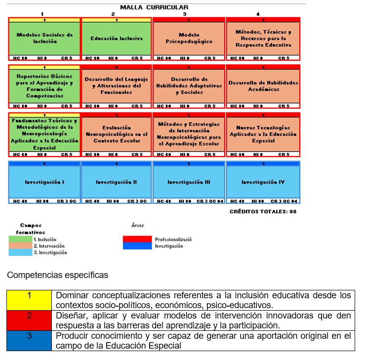La maestría en Educación especial se encuentra organizada en cuatro periodos cuatrimestrales. La modalidad del programa educativo es escolarizada. El plan de estudios se encuentra integrado por 16 unidades de aprendizaje, de las cuales doce pertenecen al área de profesionalización y cuatro al área de investigación. Estas unidades de aprendizaje se encuentran distribuidas en tres campos formativos: Inclusión, Intervención e Investigación. El programa cuenta con un total de 88 créditos, calculados mediante el Sistema de Asignación y Transferencia de Créditos Académicos (SATCA).
